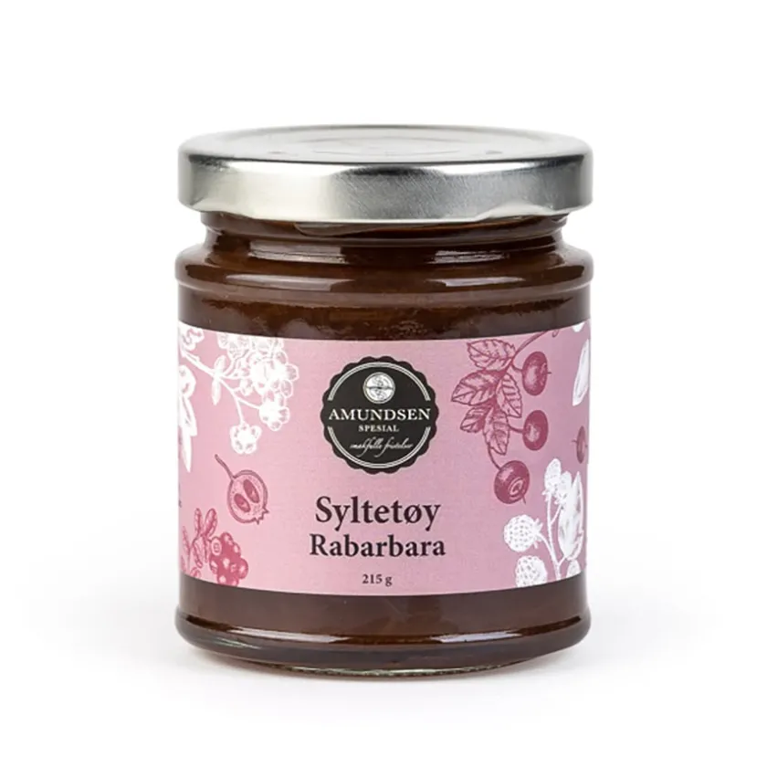 Syltetøy med rabarbra fra Amundsen. Et deilig syltetøy laget på tradisjonelle oppskrifter. Inneholder 215 gram.