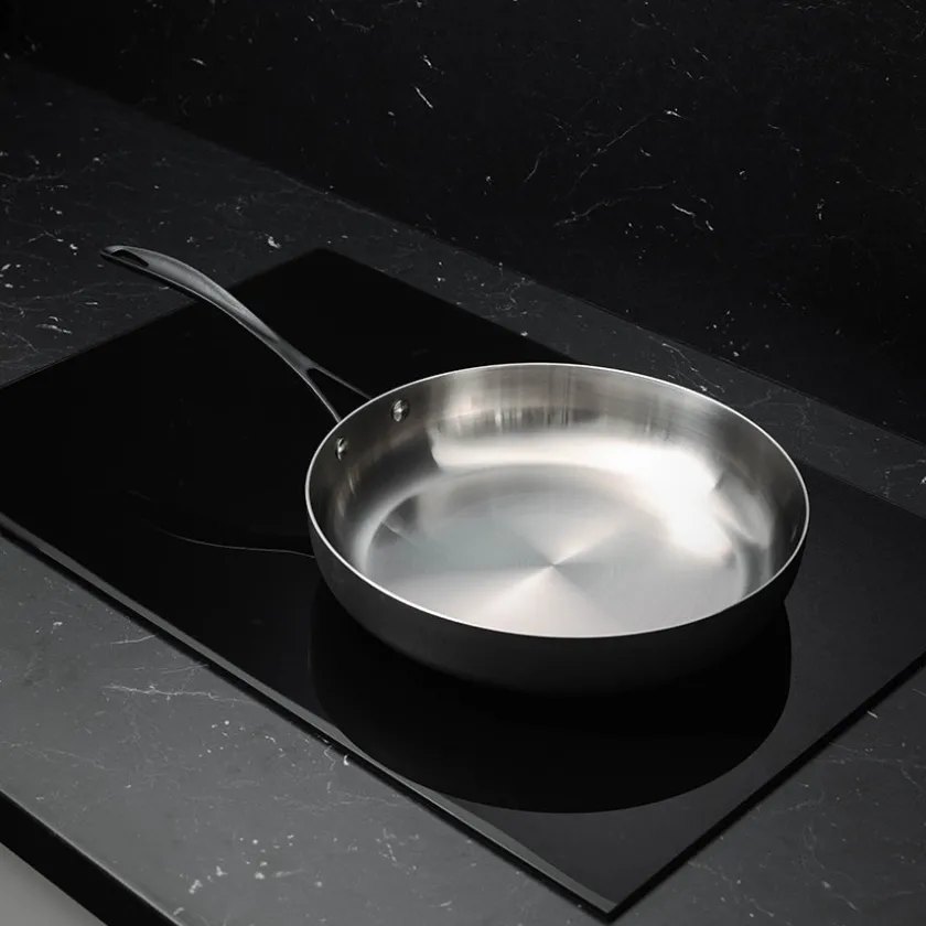 Denne stekepannen kombinerer funksjonalitet og stil, med en stor overflate som er ideell for steking av kjøtt, fisk og grønnsaker. Den er laget av 18/10 rustfritt stål med en 2,5 mm trelagskonstruksjon som gir perfekt varmefordeling og hindrer hotspots. Det oksiderte stålet gir et røft preg, mens de sorte, ovnsikre håndtakene sørger for en robust holdbarhet. Kompatibel med alle typer koketopper, inkludert induksjon.