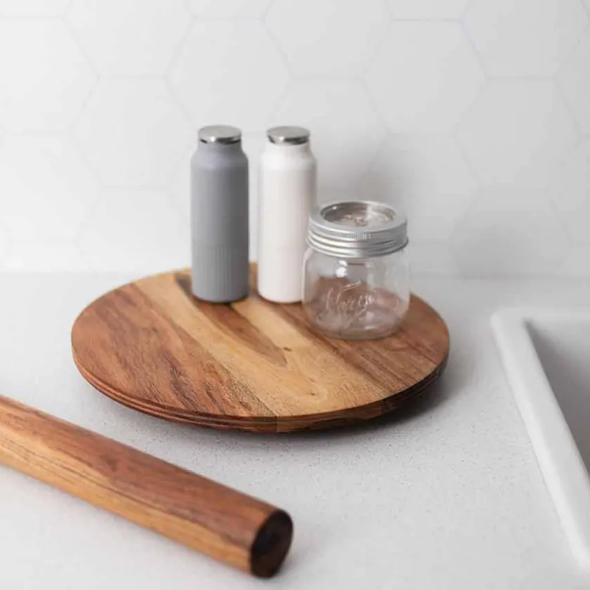 Gjør måltidene mer interaktive med dette praktiske Woods Snurrefatet i ekte acacia-tre. Med en diameter på 35 cm, er dette snurrebrettet perfekt til servering av ost, tapas, sauser eller krydder. Takket være den jevne rotasjonen, kan alle rundt bordet enkelt få tilgang til maten uten å måtte strekke seg.Den stabile konstruksjonen sørger for at brettet snurrer jevnt, samtidig som det tåler vekten av flere serveringsskåler. Acacia-tre gir en naturlig og varm estetikk som passer inn i både moderne og rustikke kjøkken.For vedlikehold bør brettet håndvaskes og tørkes umiddelbart. Treverket holder seg best ved jevnlig oljing.