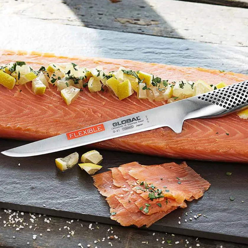 Fileteringskniv G-21 fra Global. Fileteringskniven fra Global er designet med et smalt og fleksibelt blad slik at kniven kommer helt inntil og rundt benet. Grepet er utformet med en stopp funksjon slik at kniven har et fast grep og ikke sklir. Kniven er utmerkende til filetering av fisk og rensing av kjøtt.