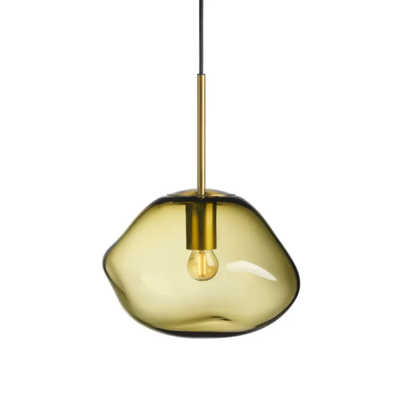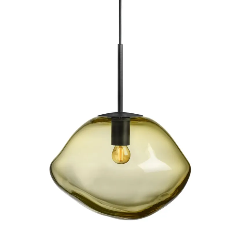Den organiske kuppelformen dannes mens glasset fortsatt er varmt, noe som sikrer at ingen lamper er helt like – et ekte stykke håndverk. Olivenfargen står vakkert alene, men får ekstra liv når den kombineres med røkgrå, kakao eller klar fra samme kolleksjon.