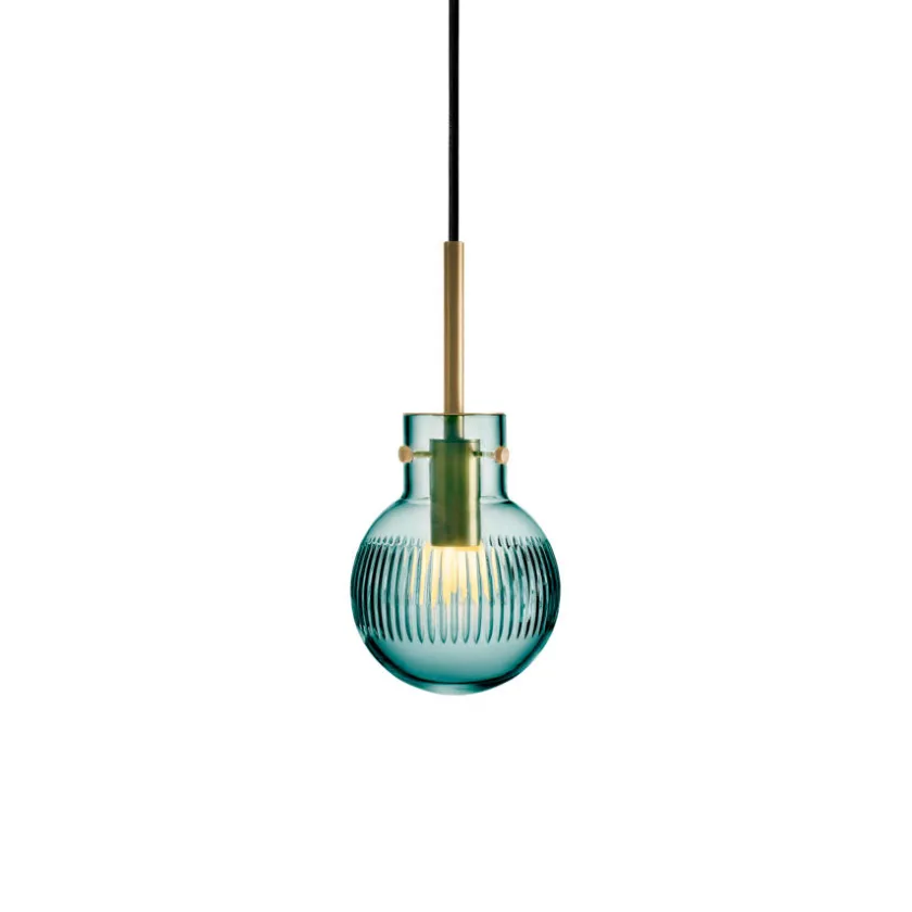 Krystallkule Taklampe Skjær i Blågrønn farge kombinerer friskhet og eleganse med et presist slipemønster. Den glatte krystallkulen håndslipes med vertikale skjær som gir lampen et spennende og levende uttrykk når lyset brytes gjennom glasset.