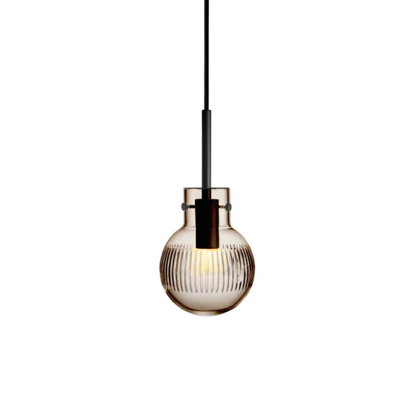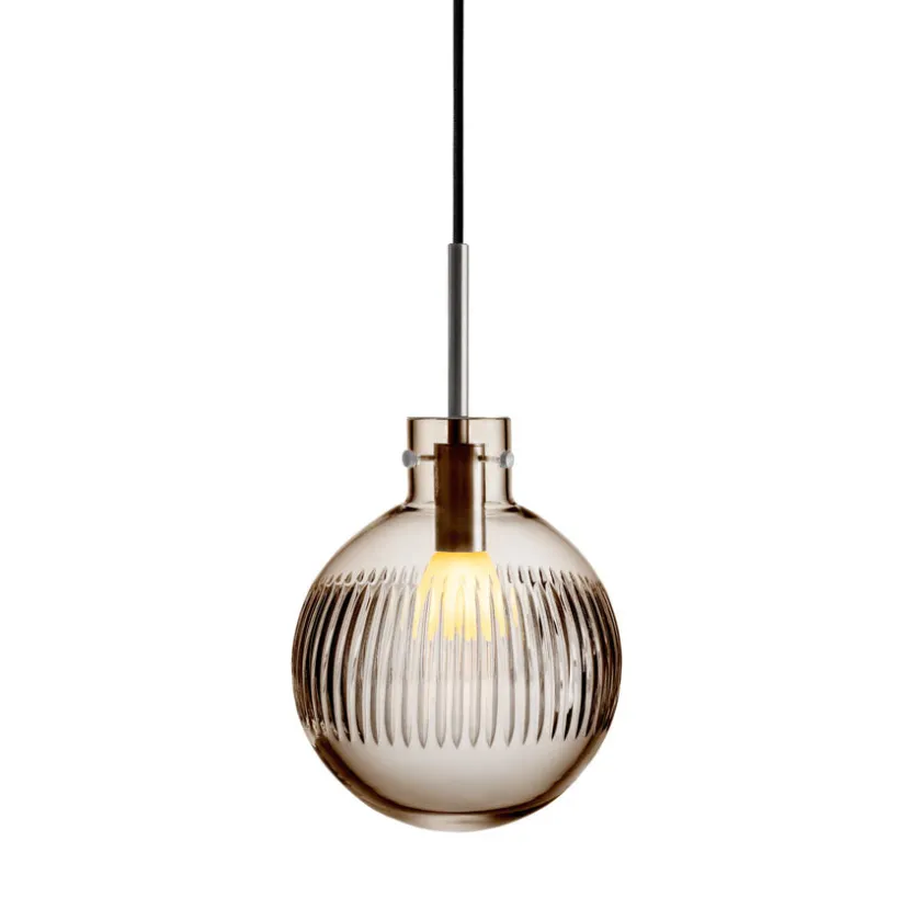 Taklampen i kakaofarget glass fremhever varme toner i kombinasjon med presist håndverk. Den glatte krystallkulen håndslipes med et vertikalt skjær-mønster som gir et sofistikert lysspill og tilfører rommet en lun atmosfære.
