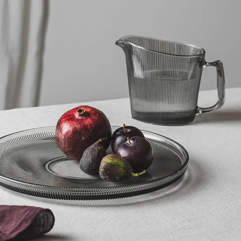 Vannmugge på 1 liter fra Hadeland glassverk sin serie Siri. Muggen er i farget røkgrå glass og kan brukes sammen med resten av delene fra serien, som vannglass og asjetter, eller brukes alene sammen med et annet pent servise. Muggen kan også brukes som en blomstervase med frisk vakre sommerblomster.