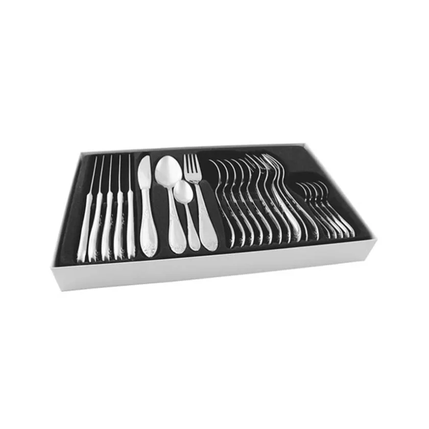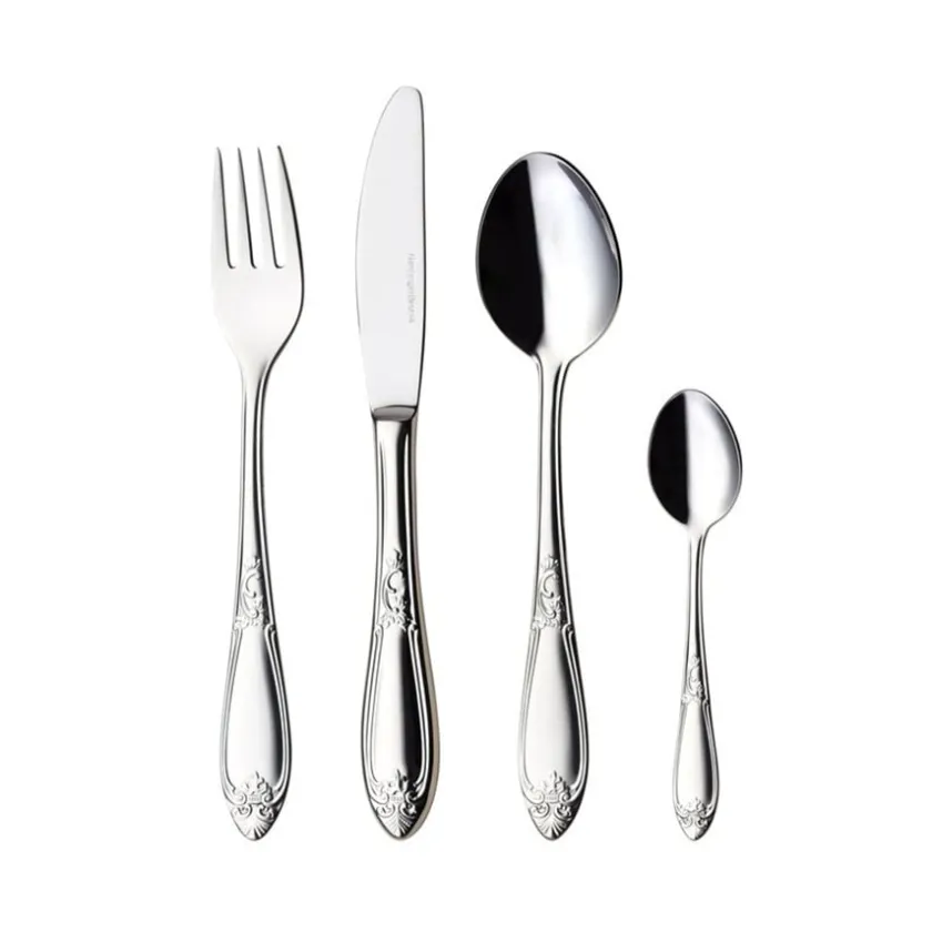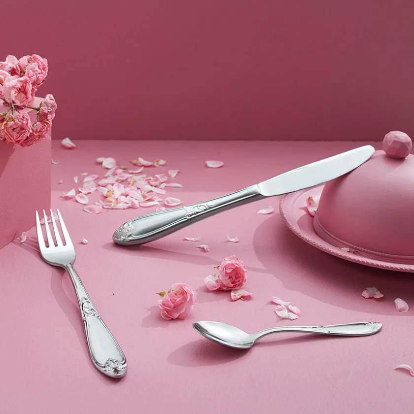 Bestikksett på 24 deler fra Hardanger Bestikk. Bestikket Nina er inspirert av rosemaling og rokokko-stilen fra 1700-tallet med sine buede former og blomstermønster. Bestikket gir det lille ekstra til et pyntet festbord og gjør hverdagsmiddagen til en fest.