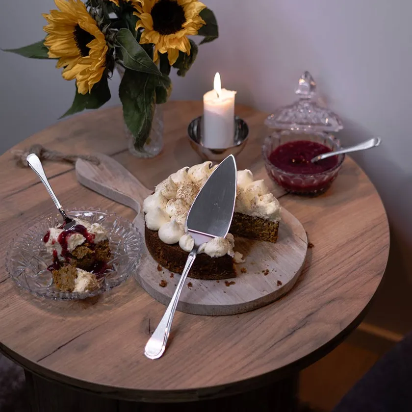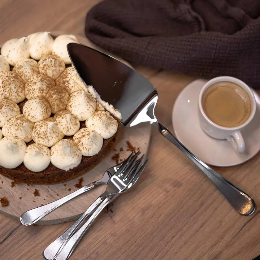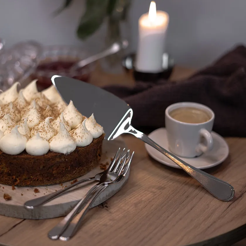 Sett med kakespade og 6 kakegafler fra Hardanger Bestikk i 18/10 stål. Bestikkserien Carina har like etter Ramona vært en av Hardanger Bestikks bestselgende bestikkserier. Med detaljer i børstet stål har Carina et elegant uttrykk som passer med de fleste serviser på både festbord og til hverdagsmåltidet.