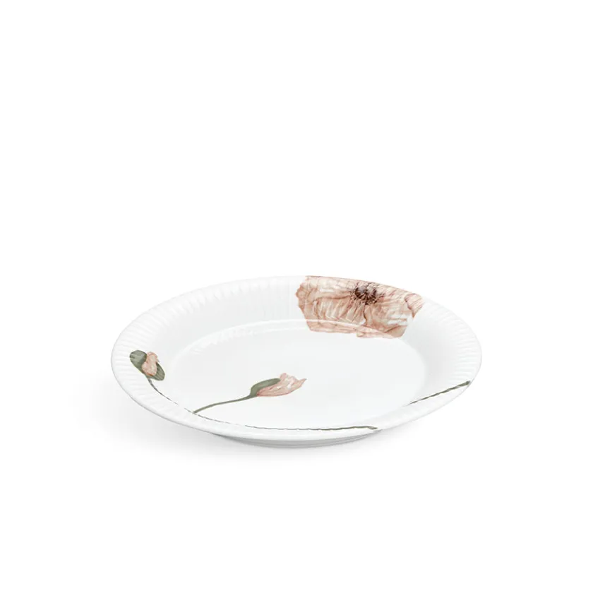 Middagstallerken fra Kahlers romantiske Poppy. Porselenserviset Hammershøi, med de karakteristiske rillene som går igjen på alle servisedeler, har fått dekorative elementer av håndmalte valmuer fra designerens akvarelltegninger og Poppy er resultatet. Det nordiske uttrykket blir mykere og Poppy-serviset bringer en helt unik stemning til et dekket bord.