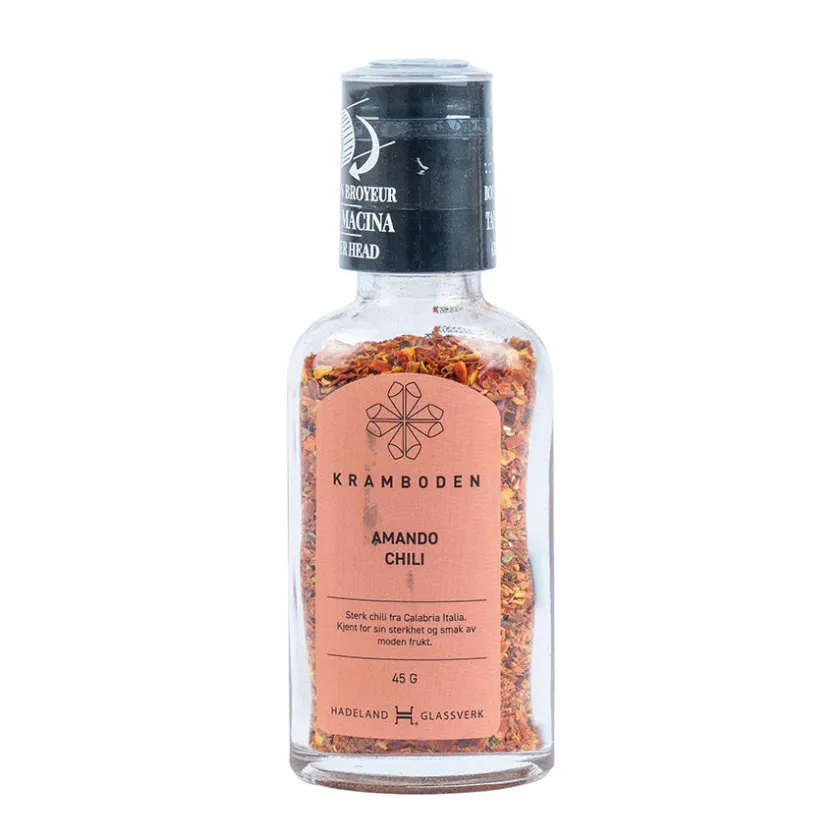 Amando chilikrydder fra Kramboden. Denne typen sterke chili kommer fra Calabria i Italia, og er kjent for sin sterkhet og smak av moden frukt. Kvernen inneholder 45 gram med krydder.