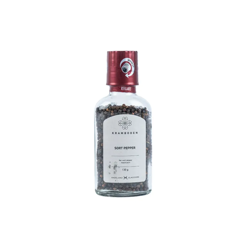 Pepperkvern med hel sort pepper fra Kramboden. Rommer 130 gram, oppbevares tørt. Unngå direkte kontakt med sollys.