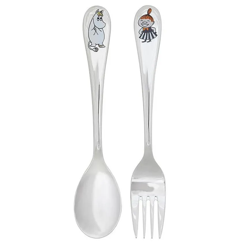 Bestikksett til barn med motiv av Snorkfrøken på skje og motiv av Lille My på gaffel. Bestikket er laget av rustfritt stål og kan vaskes i oppvaskmaskin.