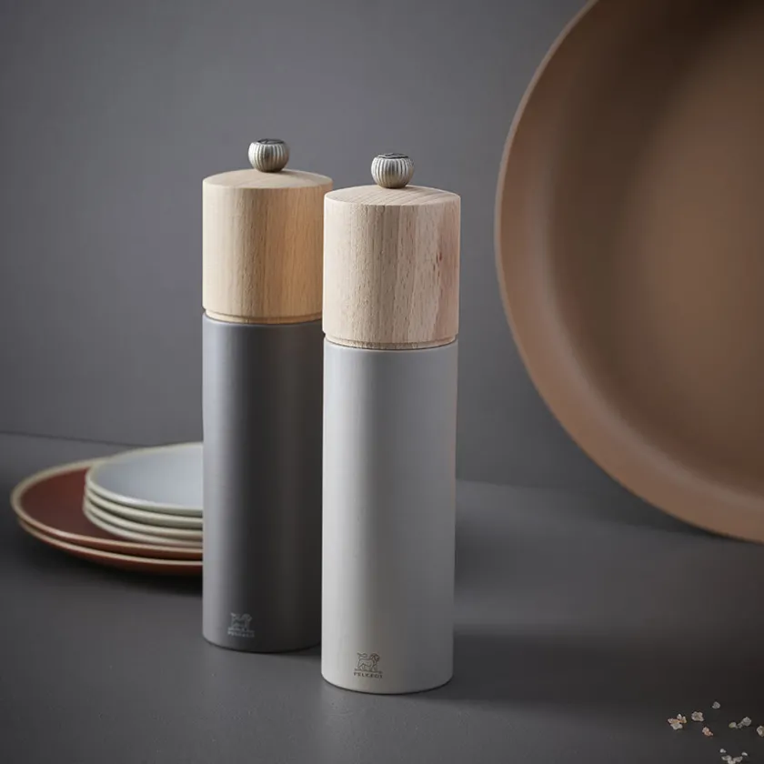 I en dempet steingrå finish og klassisk, slank silhuett gir denne pepperkvernen et moderne uttrykk til både kjøkken og spisebord. Den er utstyrt med Peugeots anerkjente stålverk for pepper, som sikrer lang levetid og jevn ytelse ved hver bruk. Passer perfekt sammen med saltkvernen i samme farge.