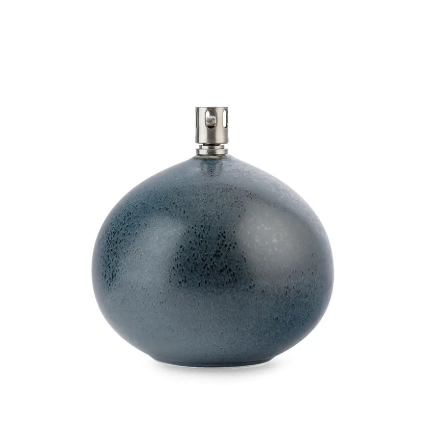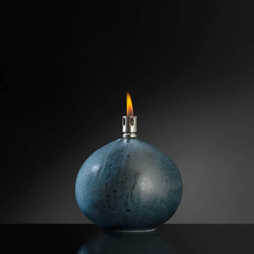 Denne mellomstore oljelampen med blå reaktiv glasur er både praktisk og dekorativ. Formen, inspirert av rullesteiner, og glasurens unike spill av farger gjør lampen til et blikkfang. Brenneren er laget av stål med glassfiberveke for stabil og trygg bruk, og lampen er CE-godkjent.