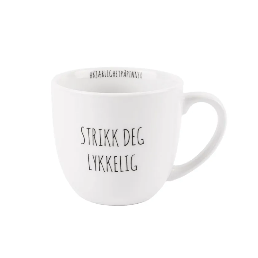 Krus med påskriften » Strikk deg lykkelig» til en som elsker å strikke! Hva er vel bedre for en strikkeentusiast enn å lene seg tilbake i en god stol med strikketøy og en deilig kopp te.