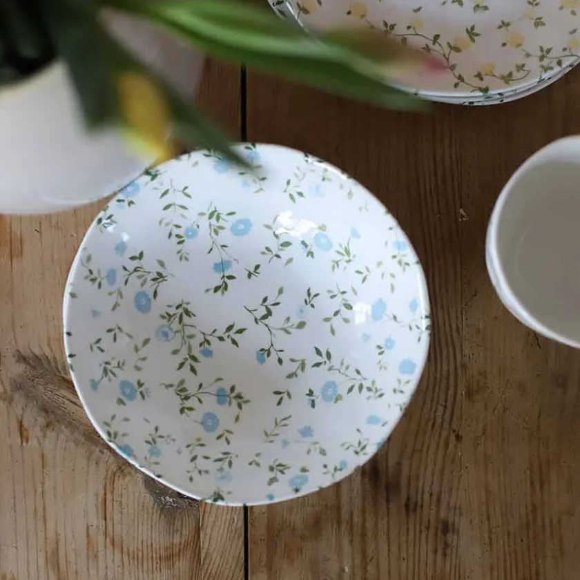 Den blå Maia-bollen er et tidløst valg for enhver borddekking. Med sitt småblomstrete mønster gir den et nostalgisk preg, samtidig som den passer inn i moderne hjem. Perfekt til yoghurt, salater eller frukt. Porselenet er av høy kvalitet og tåler daglig bruk. Kan vaskes i oppvaskmaskin.