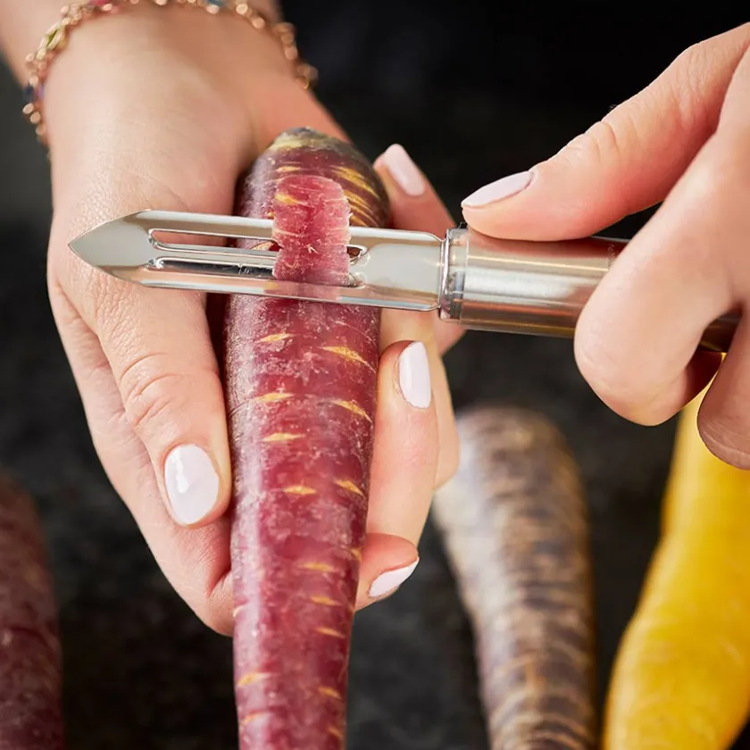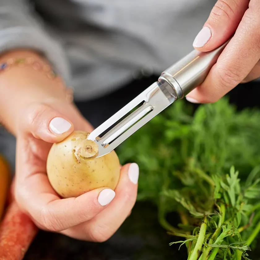 Stilren grønnsaksskreller fra Rösle. Sikrer en enkel og rask skrelling av grønnsaker og frukt. Skrelleren kan rengjøres i oppvaskmaskin.