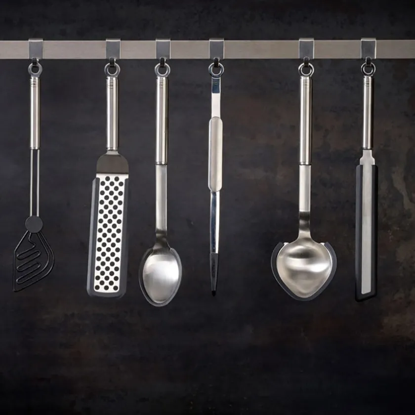 Tang 32 cm fra Rösle. Tangen er fremstilt i stål og gripeoverflaten er utformet med silikon som gjør den skånsom mot belegget i gryten og pannen. Skaftet på tangen er formet for et behagelig og godt grep, og på enden av skaftet er det en krok for opphenging.