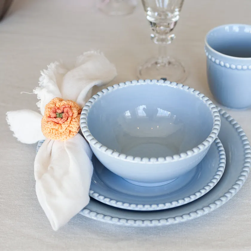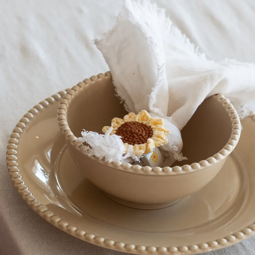 Gi borddekkingen et friskt og sommerlig preg med disse sjarmerende serviettringene i porselen, dekorert med blomster i hvit og oransje. De heklede blomstene gir en myk kontrast til den glatte, glaserte porselensringen – perfekt til å skape et lunt og innbydende bord.Dette settet passer ypperlig til både uformelle og høytidelige anledninger – fra sommerfrokost på terrassen til påskefeiring, bursdag eller grillkveld. Blomstene gir et naturlig og glad uttrykk som fremhever både lyse og fargerike servietter.Med sitt lekne design blir disse serviettringene et dekorativt element i seg selv. Kombiner dem gjerne med matchende servise eller blomster på bordet for en helhetlig og gjennomført stil.