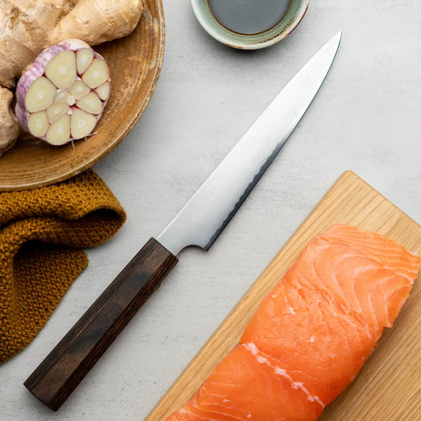 Det ergonomiske håndtaket i mørk pakkawood gir både slitestyrke og en behagelig følelse, mens det kantete designet forsterker det tradisjonelle japanske uttrykket serien Hana er kjent for.