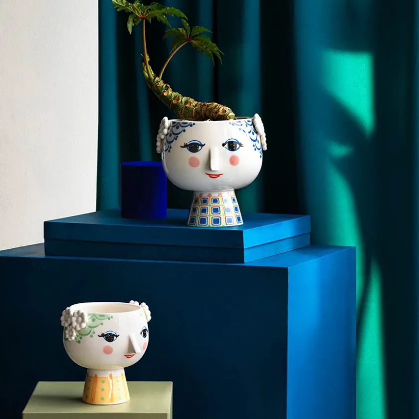 Potteskjuler på fot fra Bjørn Wiinblad og serien Eva. En smilende Eva potteskjuler i vakre blå nyanser og blankglasert keramikk, perfekt til mellomstore blomster og blomster dekorasjoner. Måler 21 cm i høyden og 21 cm i diameter.