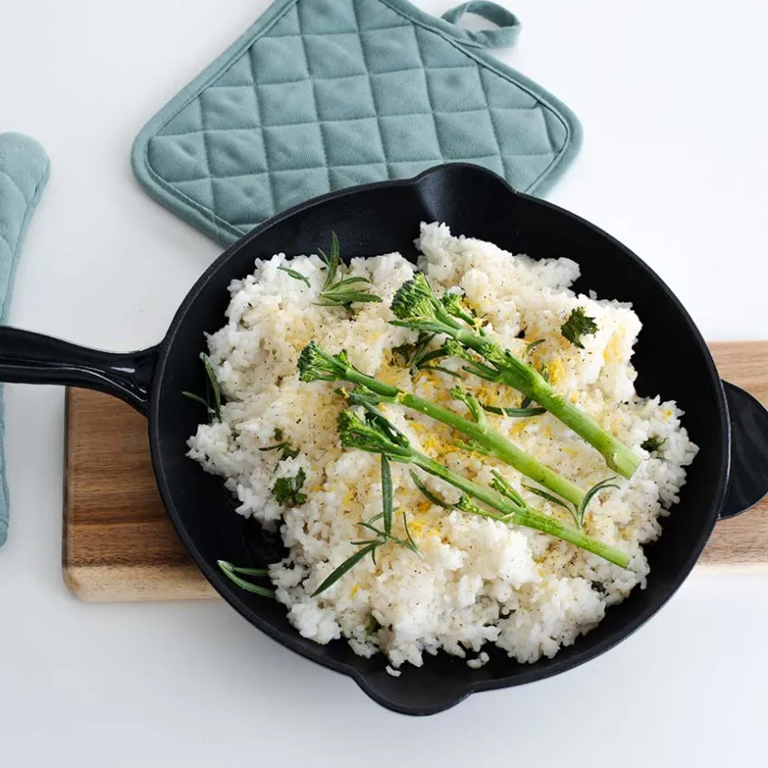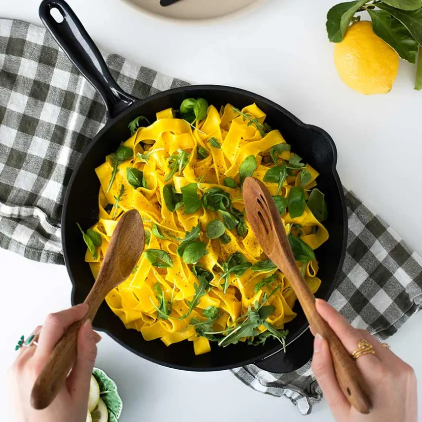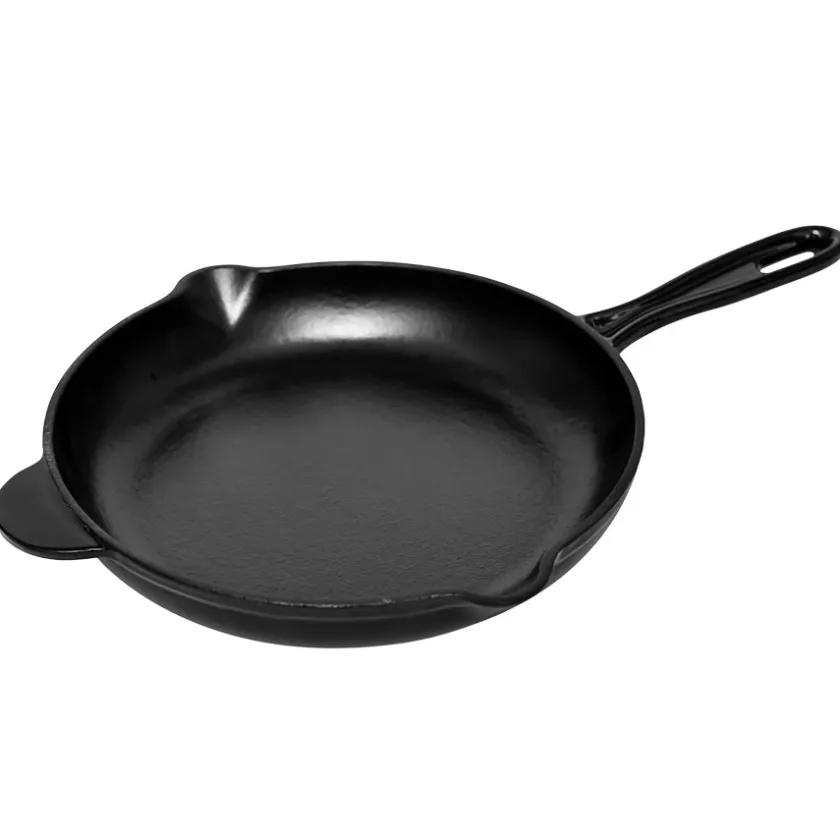 Sort støpejernspanne på 27 cm med emaljert fargebelegg fra Christiania Glasmagasins egen merkevare Christiania 1739. Støpejern har den fantastiske egenskapen at den jevnt og effektivt fordeler varmen i hele pannen og gjør matlagingen til en lek. Håndvask anbefales. Unngå å bruke metallbørster eller skurebørster da disse kan skade emaljen. Les mer om vedlikehold av pannen under tilleggsinformasjon.