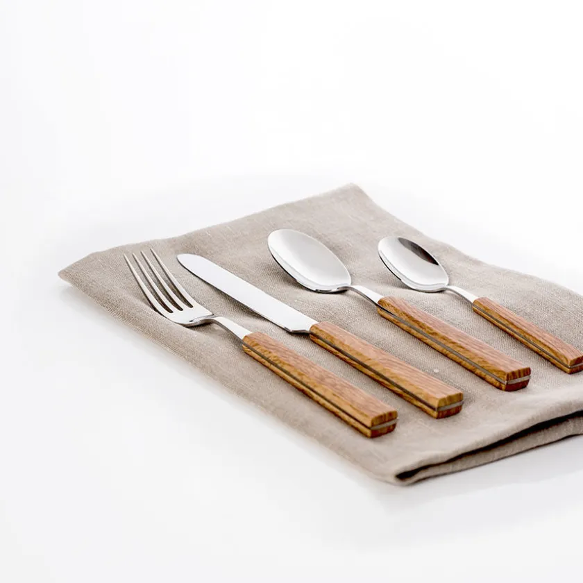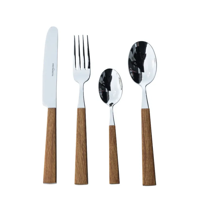24 delers bestikksett i et retro design fra Christiania Bestikk. Bestikket er fremstilt i 18/10 rustfritt stål i høy kvalitet og designet med et grep i lyst imitert treverk, som sammen skaper et stilfullt uttrykk til bordet. Settet inneholder deler til 6 personer.