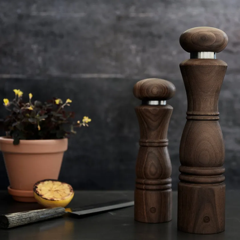 Paris krydderkvern i valnøtt og rustfritt stål fra Crushgrind. Den flotte kvernen er utstyrt med Crushgrind sin patenterte mekanisme, og skaper med sin vakre kombinasjon av valnøtt og rustfritt stål et elegant uttrykk til kjøkkenbenken. Kvernen måler 29 cm og kan brukes til salt eller pepper.