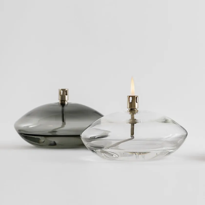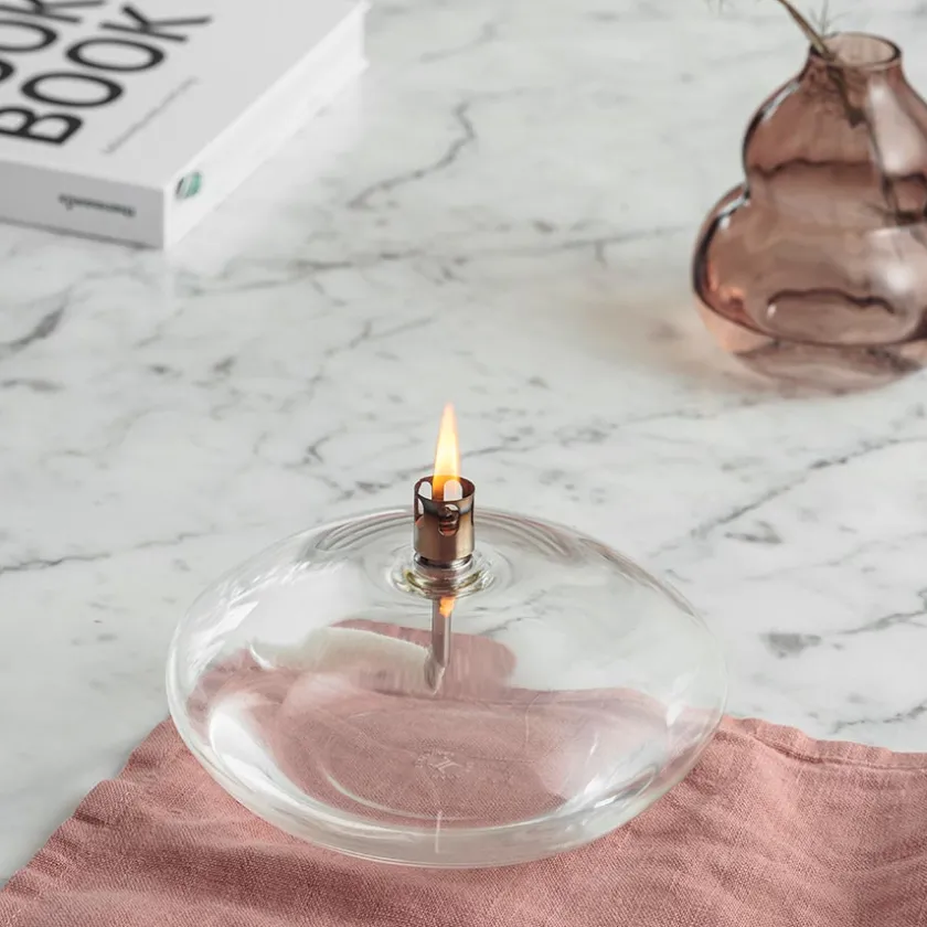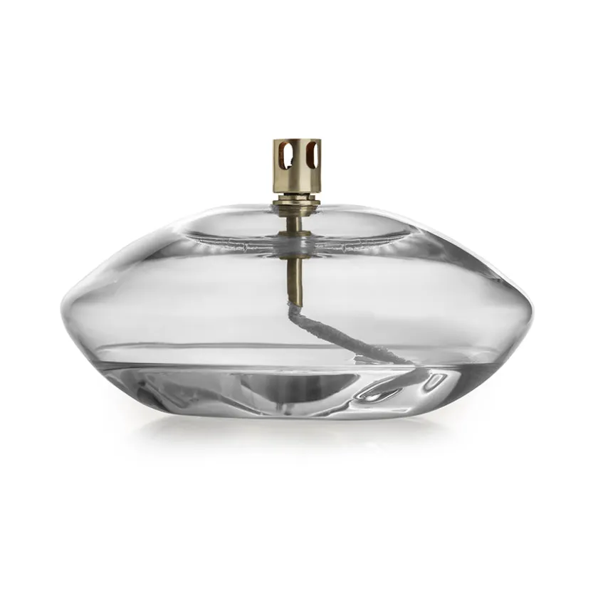Oljelampe fra Hadeland Glassverk i klart glass. Oljelampen er en perfekt harmoni av tradisjonelt håndverk og moderne design som gir rommet en lun og koselig stemning. Lampen kan plasseres på for eksempel spisebordet, på en skjenk eller en hylle, og blir et visuelt og samtidig praktisk dekorelement. Olje medfølges ikke.
