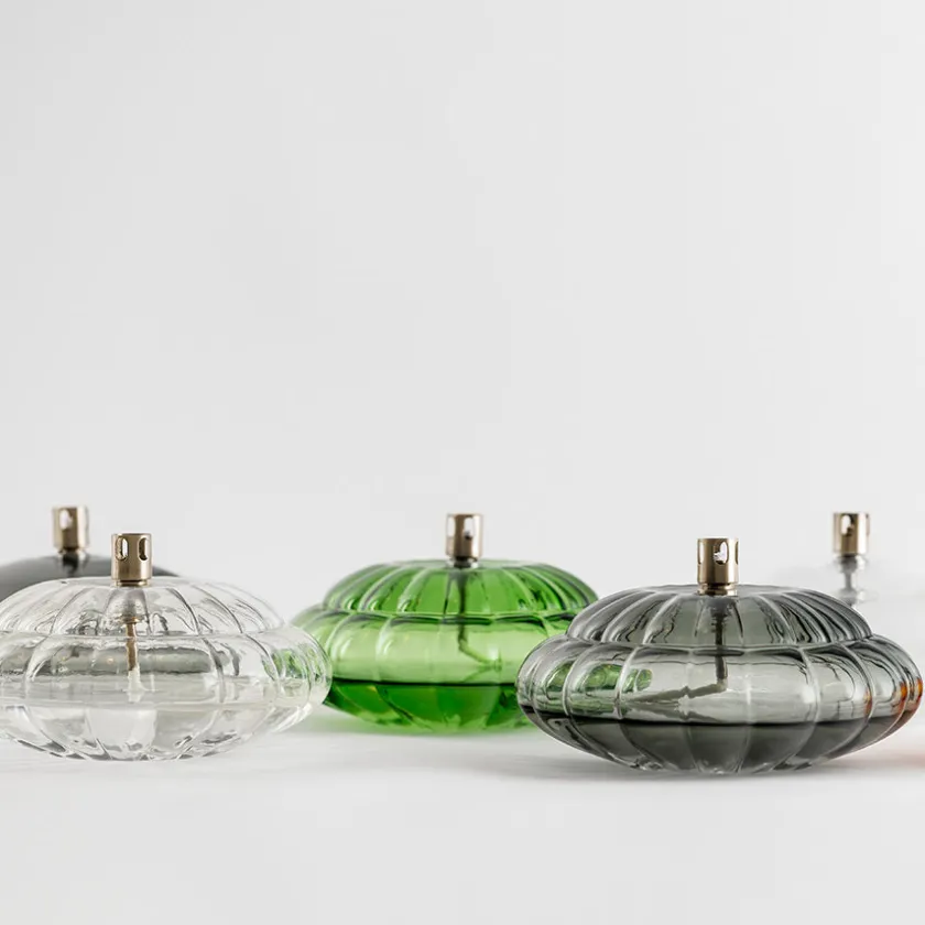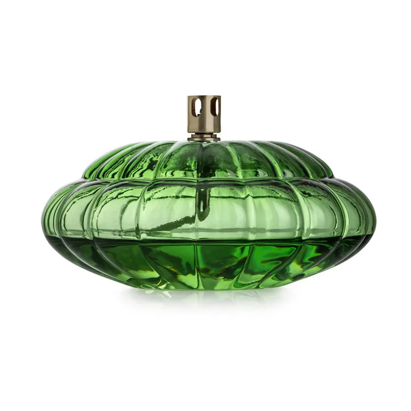 Oljelampe i en nydelig grønn tone fra Hadeland Glassverk og serien Aurora, designet av Maud Gjeruldsen Bugge. Den dekorative oljelampen er designet i optisk glass, som sammen med den myke flammen skaper en avslappende og rolig atmosfære til stuen. Lampen måler 15 cm og olje kjøpes separat.