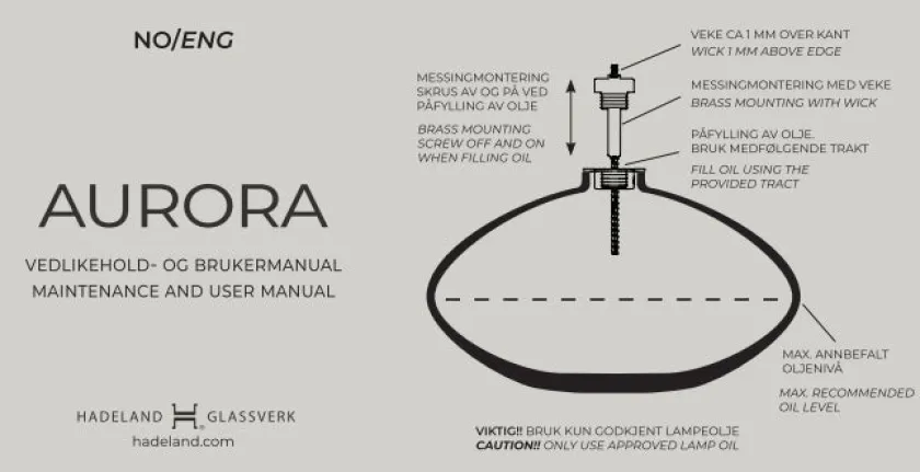 Fyll aldri oljen til mer enn anbefalt mål som vises i bruksanvisningen medfulgt. Veken skal ikke stikke opp mer enn 1 mm over kanten. Bruk kun godkjent lampeolje. La aldri produktet stå uten tilsyn når den er tenkt. Dersom flammen er for høy, blafrer eller soter er veken for høy. Blås ut lyset, la den stå til den blir kald og trykk forsiktig ned veken til riktig høyde.