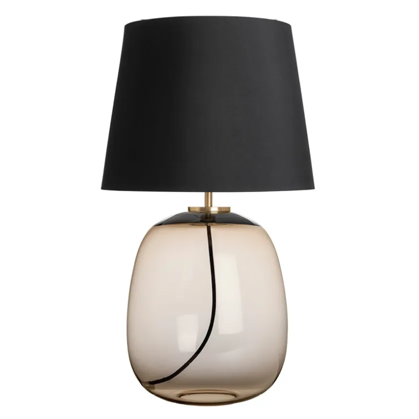 Austra Bordlampe Kakao bringer varme og naturlig eleganse inn i hjemmet. Den munnblåste glassfoten i en dyp, jordnær kakaonyanse gir en lun kontrast til den lyse tekstilskjermen. Lyset filtreres behagelig gjennom skjermen og gir en rolig atmosfære, perfekt for stuen, soverommet eller en lesekrok.