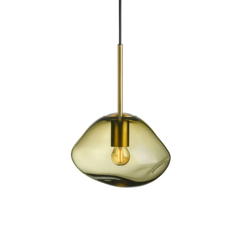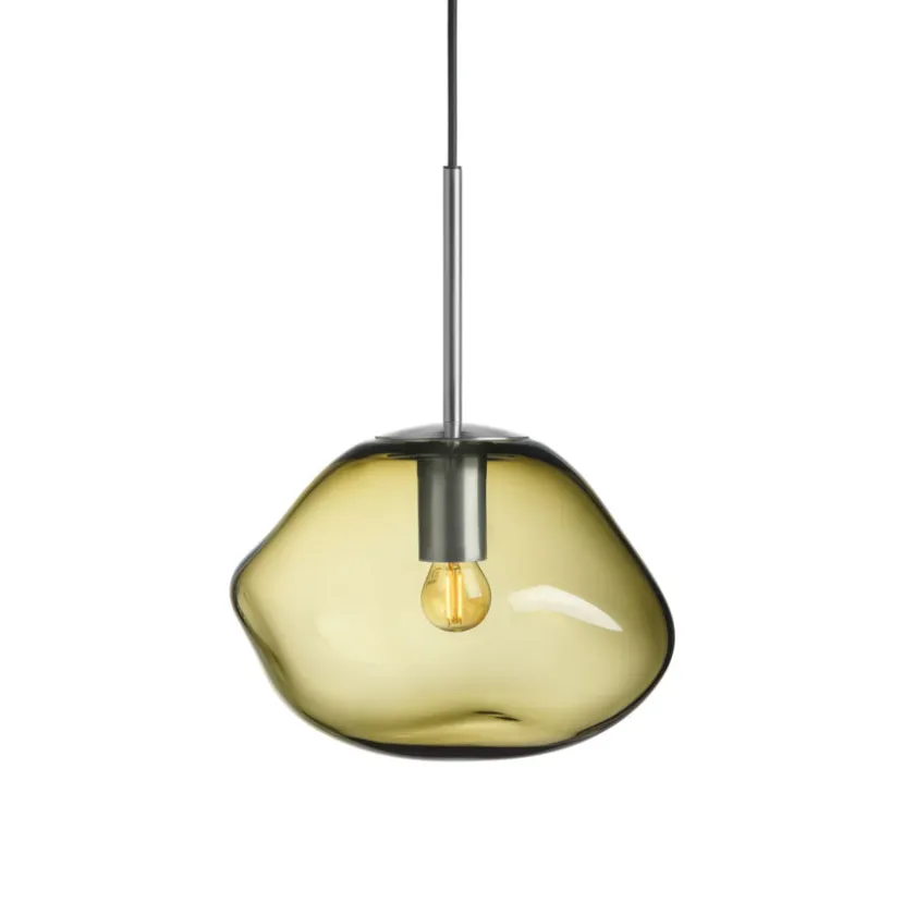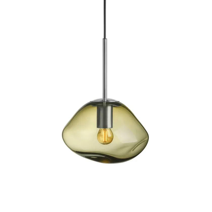 Den organiske kuppelformen dannes mens glasset fortsatt er varmt, noe som sikrer at ingen lamper er helt like – et ekte stykke håndverk. Olivenfargen står vakkert alene, men får ekstra liv når den kombineres med røkgrå, kakao eller klar fra samme kolleksjon.