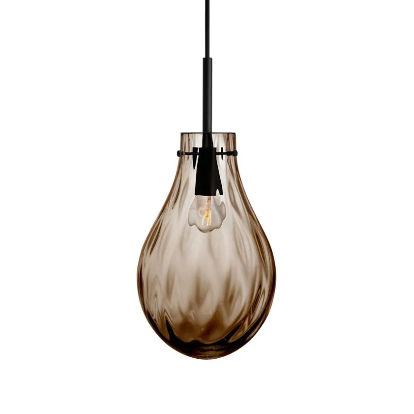 Den nydelige lampen Dråpe Dobbeltoptikk i fargen kakao henter sin inspirasjon fra vannets myke bevegelser og reflekterende overflater. Den munnblåste glasskuppelen har en dyp, varm kakaofarge og kombinerer to ulike mønstre i glasset – en unik dobbeltoptikk som gir et fascinerende spill av lys og skygger på veggen. Effekten er både levende og beroligende, og lampen er like vakker alene som når den henger i en klynge.
