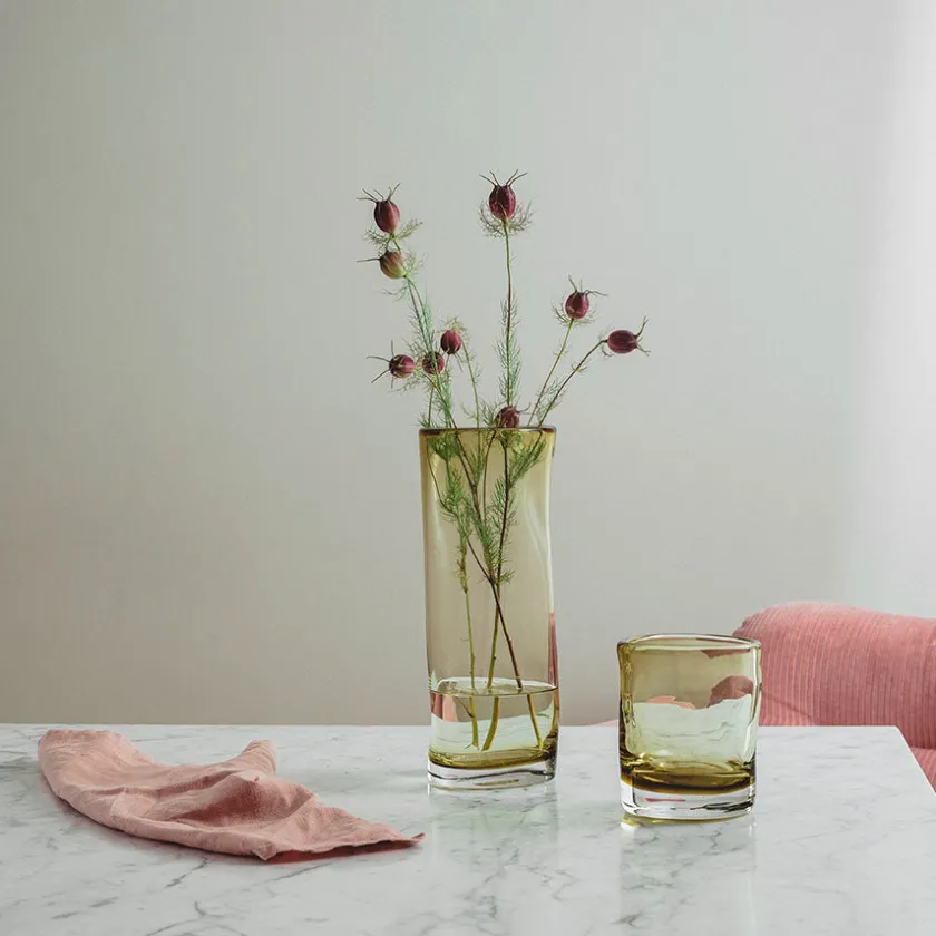 Munnblåst vase fra serien Sine og Hadeland Glassverk. Den vakre serien Sine, designet av Maud Gj. Bugge, består av organiske vaser i fargene oliven og røkgrå. Vasen måler 29,5 cm x 11 cm og er designet i en delikat olivenfarge, perfekt til alt fra dekorative strå til din favorittoppsats. Hvert delikate stykke fra serien Sine munnblåses og håndslipes på Hadeland Glassverk, som gjør hvert produkt unikt.