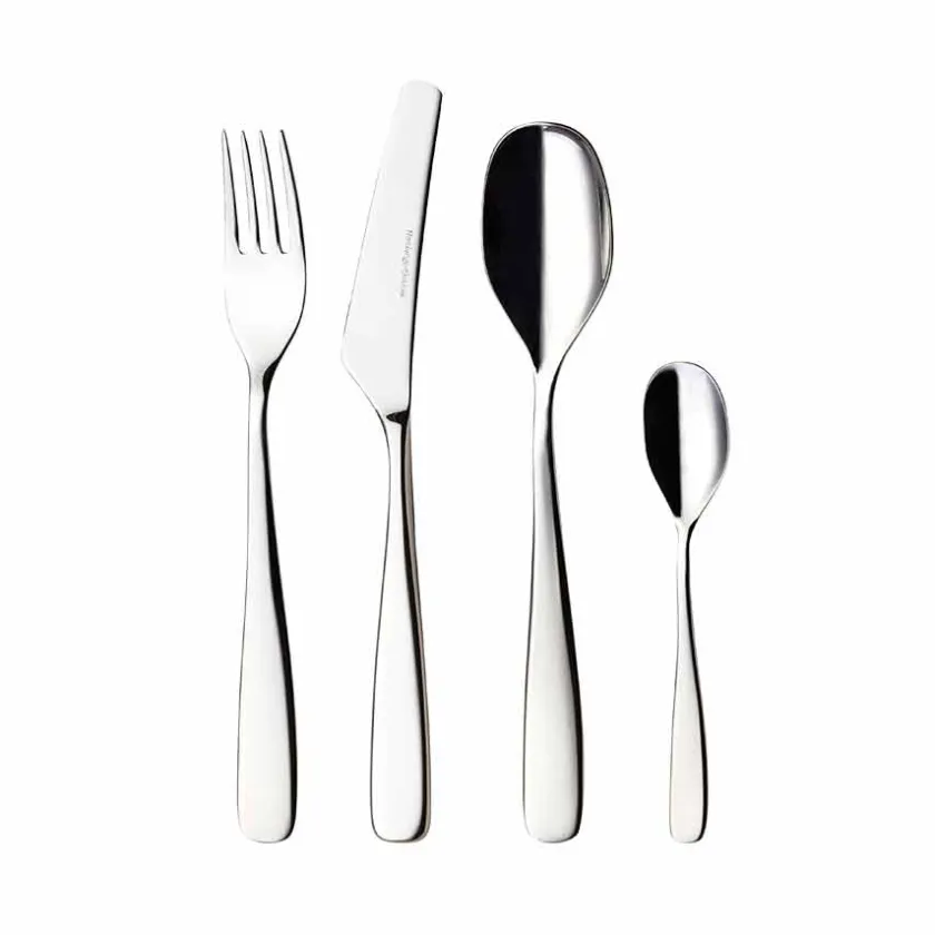 Tuva Bestikksett med 24 deler er en komplett løsning for borddekking. Settet inneholder spisekniver, gafler, skjeer og teskjeer i rustfritt stål, kjent for sitt elegante design og gode ergonomi.