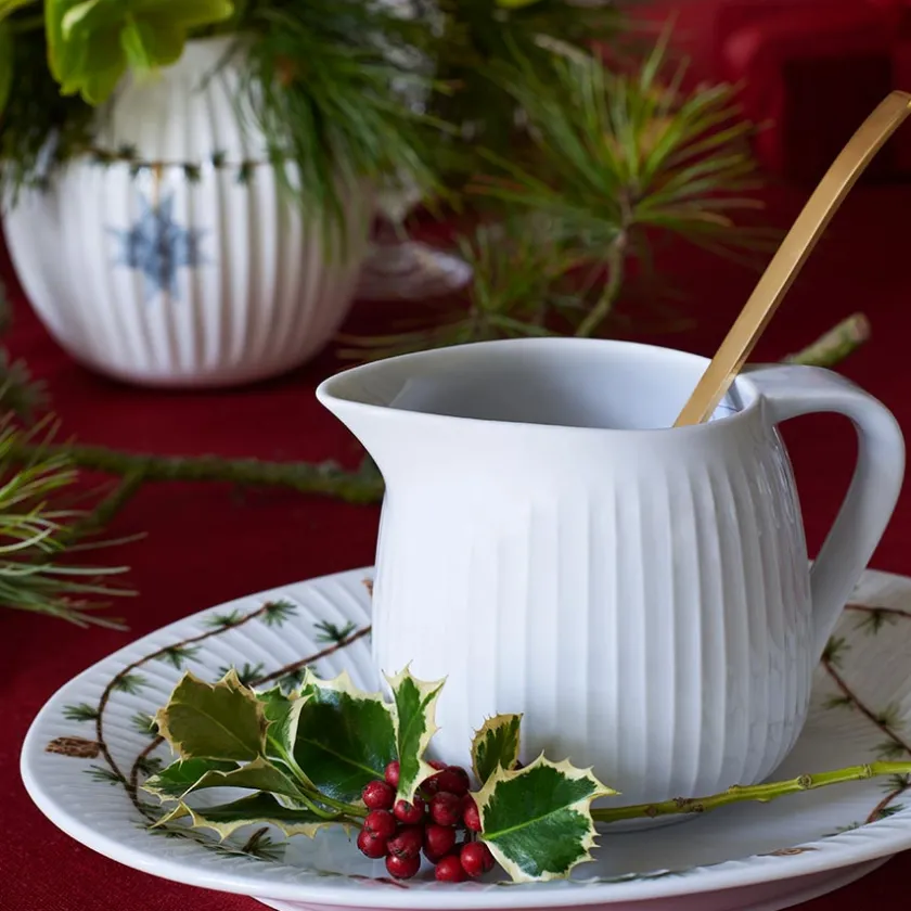 Sausekanne 66cl i hvit fra Kähler i serien Hammershøi. Det tidløse serviset Hammershøi er designet av Hans-Christian Bauer som hentet sin inspirasjon fra Svend Hammershøis verk, som ble laget på det gamle Kähler -verkstedet på begynnelsen av 1900-tallet. De klassiske rillene i det hvite porselenet gir serien et unik og tidløst design.