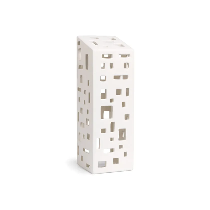 Lyshus utformet som et høyhus fra Kähler og serien Urbania. Det elegante lyshuset er formet som et modernistisk leilighetshus som sprer et fantastisk lys og skygger gjennom de håndskårne vinduene. La lyshuset skinne alene, eller skap en vakker porselensby med de ulike lyshusene fra Urbania serien. Lyshuset er 22 cm høy og 7,5 cm bred.
