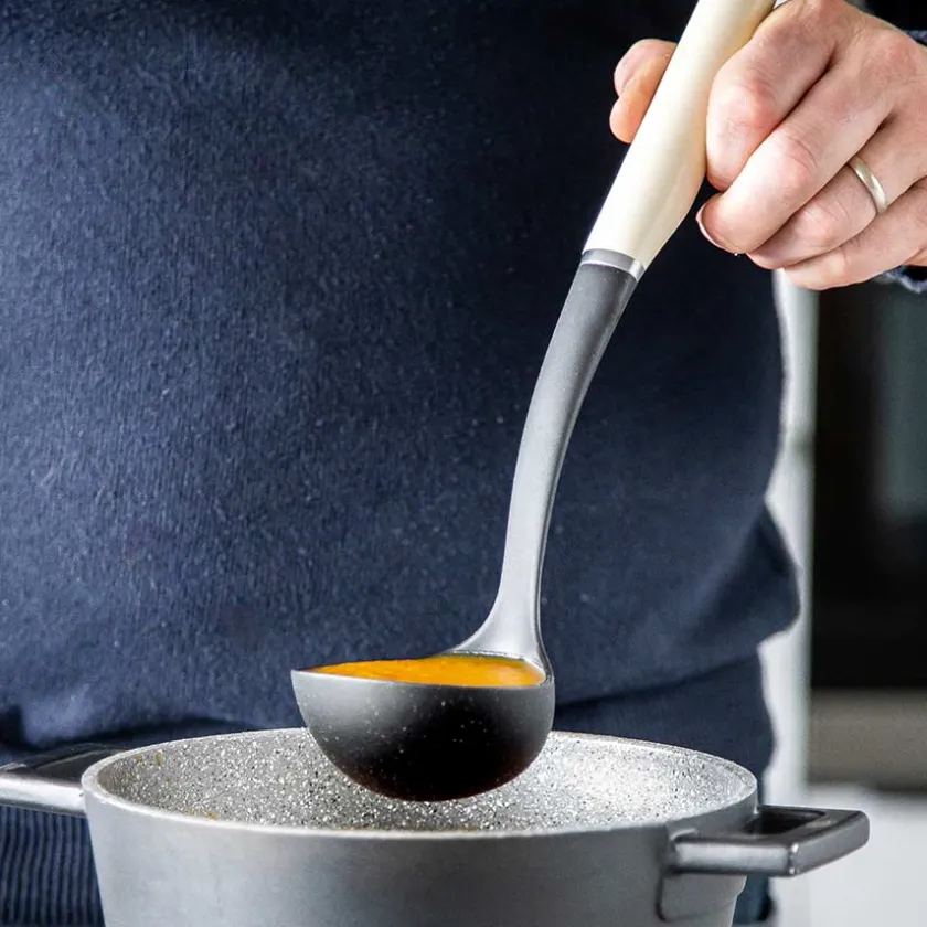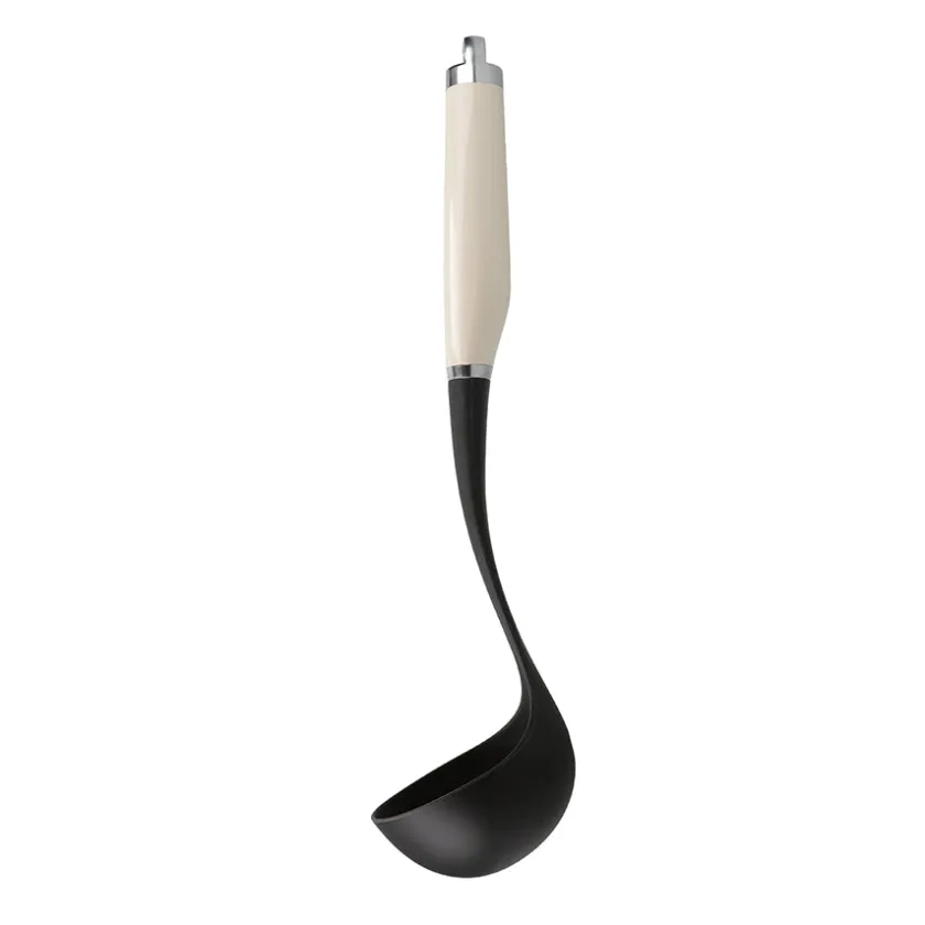 Øse i nylon fra KitchenAid. Øsen kan brukes i alle typer gryter og kjeler, både med og uten belegg, og tåler opptil 232°. Med et komfortabelt håndtak i en stilfull kremfarge blir øsen like flott til tilbereding som til servering. Øsen kan rengjøres i oppvaskmaskin.