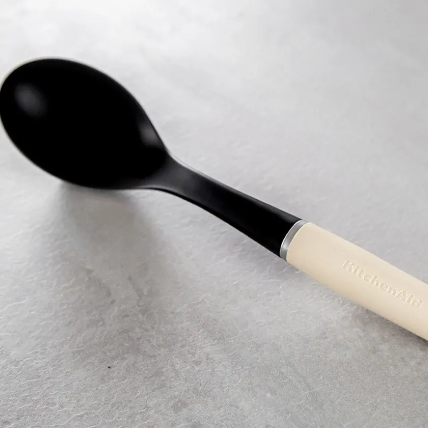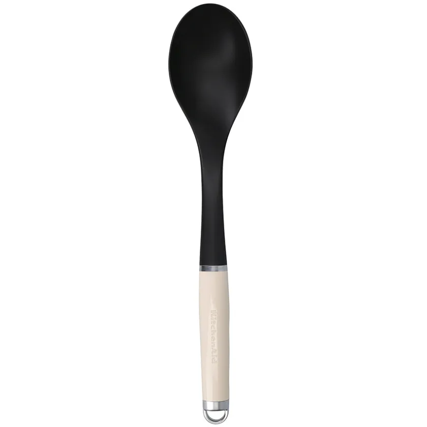Skje på 35 cm fra KitchenAid. Røreskjeen er laget i det skånsomme materialet nylon, som gjør den ideell til bruk i alle typer kokekar og panner, både med og uten belegg. Håndtaket kommer i en stilfull kremfarge og er utformet for et komfortabelt grep. Skjeen er varmebestandig på opptil 232°C og tåler oppvaskmaskin.