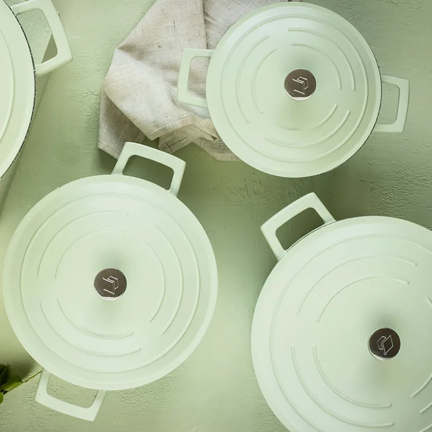 Stilrik gryte i mintgrønn fra Masterclass. Grytens materiale av støpt aluminium gir det tøffe og robuste som en støpejernsgryte, men er et lettere materiale å håndtere. Aluminium er en utmerket varmeleder, som dermed siker en jevn og effektiv tilberedelse, og med et to-lags ripesikkert belegg får du de samme gode egenskapene som ved non-stick. Gryten tåler stekeovn, alle kokertopper inkludert induksjon, og kan rengjøres i oppvaskmaskin.