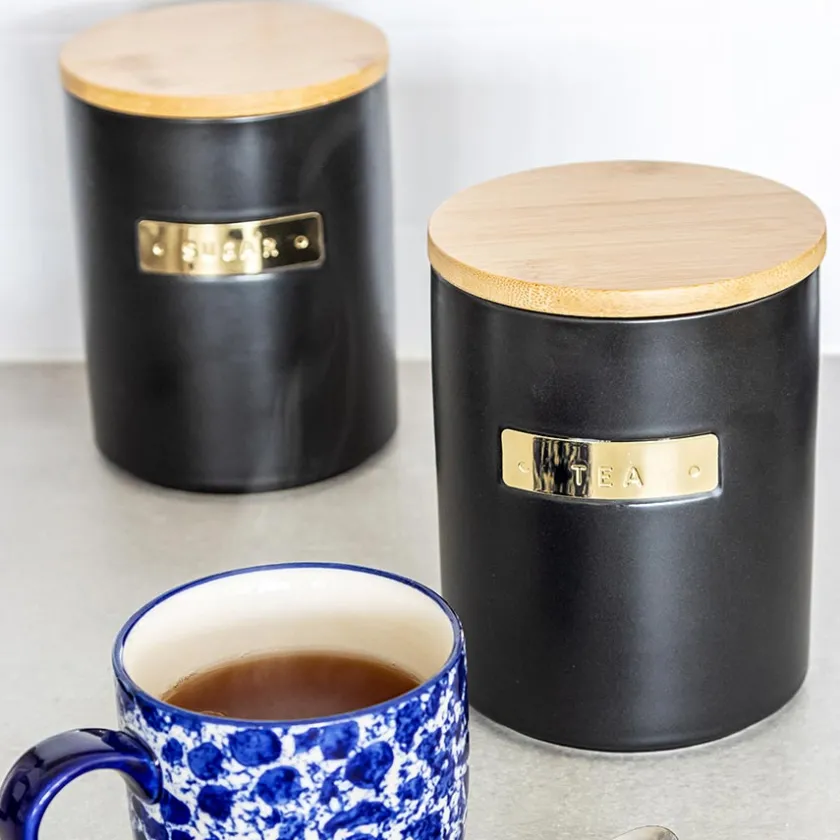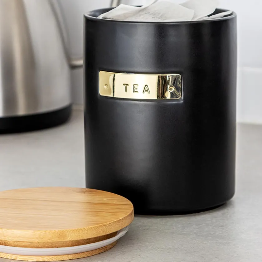 Sort oppbevaringsboks til te i 1 liter med lokk fra Masterclass. Hold det organisert på kjøkkenet med den stilfulle teboksen med et elegant lokk av bambus som sørger for en lufttett forsegling. La oppbevaringsboksen stå pent alene, eller kombiner den med en av de andre oppbevaringsboksene til kaffe eller sukker i samme flotte design fra Masterclass.