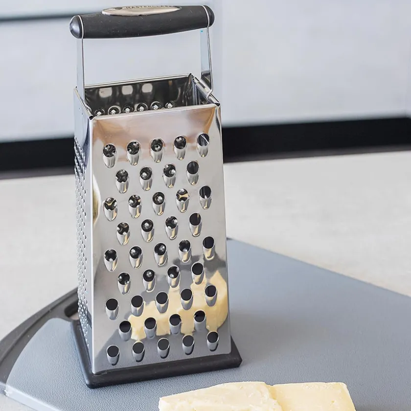 Rivjern fra Masterclass. Et komfortabelt rivjern med et sklisikkert håndtak, perfekt til å raspe alt fra sjokolade til ost. Rivjernet er fremstilt i rustfritt stål og utformet med fire ulike blader for skivet, grov, middels og fin rasping av maten. Kan rengjøres i oppvaskmaskin.