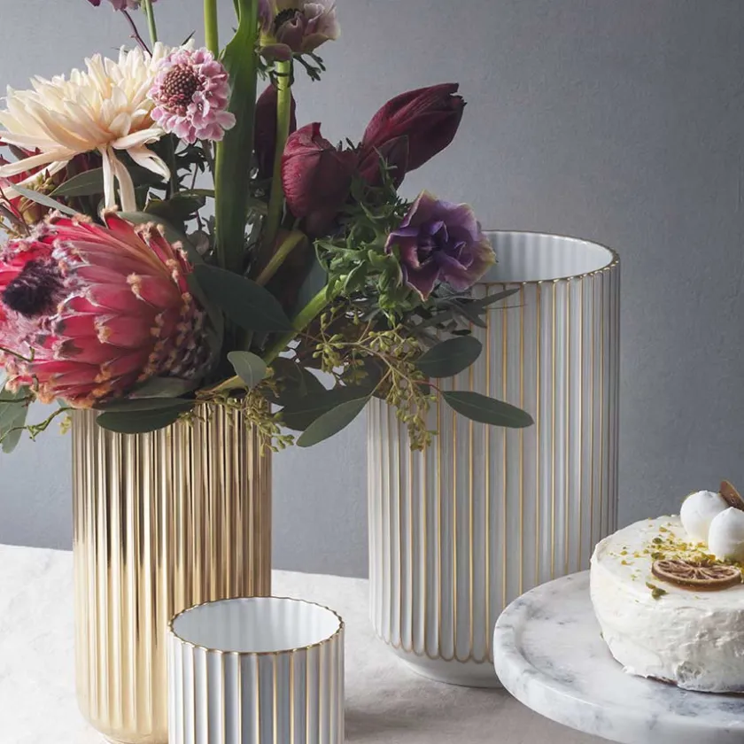 Vase på 20,5 cm fra Lyngby Porcelæn i fargen gull. Den klassiske Lyngby-vasen kommer i et stilrikt og minimalistisk design, perfekt til fremvisning av blomster, lys eller som et dekorelement uten noe i.
