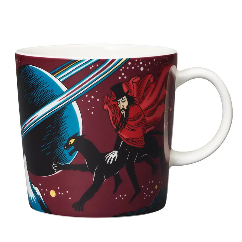 Mummikopp fra Arabia med motiv fra det kjente Mummiuniverset. Den mystiske Trollmannen rir på sin svarte panter over himmelen, på leting etter den største og vakreste rubinen som finnes, nemlig Kongerubinen. De populære samleobjektene i porselen fra Arabia er ildfaste og tåler ovn og mikrobølgeovn, men må stå på rist i ovnen og ikke bakeplate. Mummikoppen kan vaskes i oppvaskmaskin.