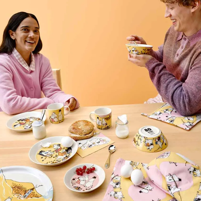 Denne større asjetten på 19 cm er et perfekt innslag for familiemåltider. Motivet fra «Familietid»-serien feirer Mummi-familiens kjærlighet og samhold, med varme gule og rosa toner som skaper en innbydende stemning. Laget av holdbart porselen, tåler den daglig bruk og oppvaskmaskin. Passer til middag, lunsj eller kaker. En ideell gave til de som elsker Mummi.