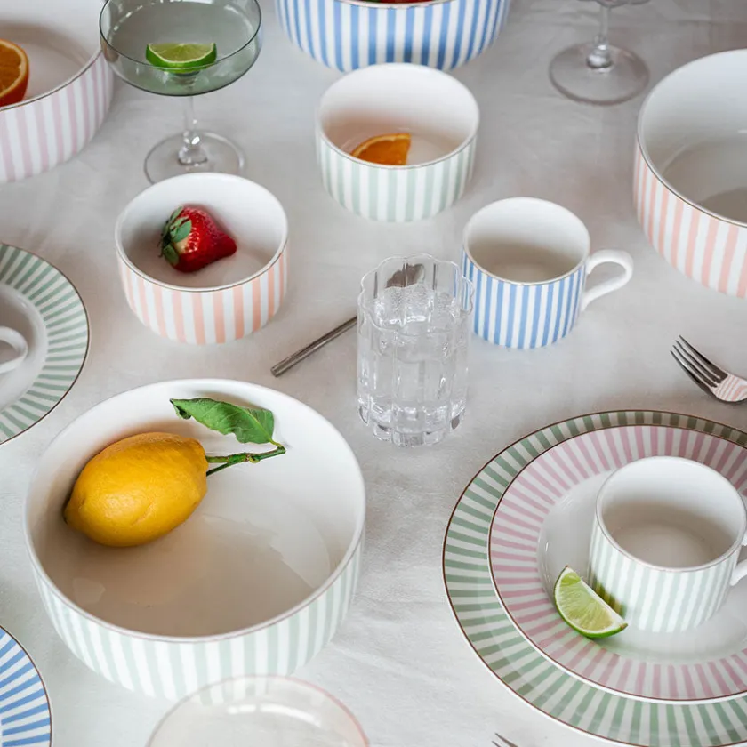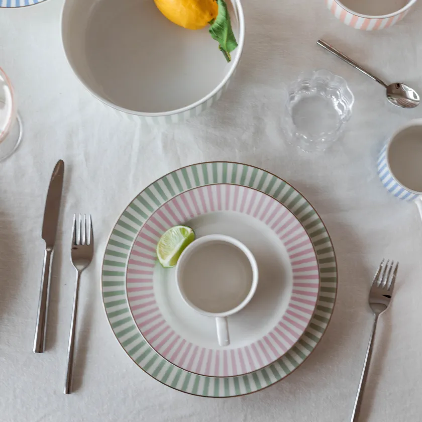 Abby middagstallerken i dus grønn med gullkant bringer en rolig og naturlig atmosfære til borddekkingen. Denne elegante tallerkenen på 26 cm kombinerer moderne striper med myke fargetoner og luksuriøse detaljer – perfekt til både hverdag og spesielle anledninger.