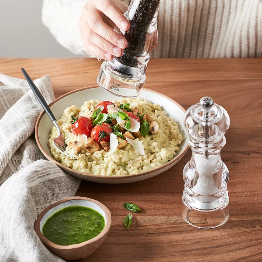 Nancy-serien kombinerer klassisk form med moderne gjennomsiktighet. Denne 18 cm pepperkvernen i klart akryl lar deg se innholdet og gir full kontroll på påfyll. Det rustfrie stålverket er spesiallaget for pepper og gir jevn maling hver gang, ideell for både kokk og gjest.