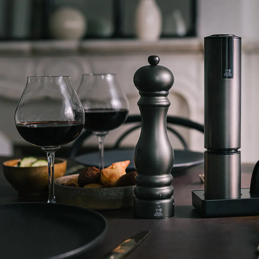 Paris Chef i karbonfinish gir et moderne, industrielt preg, kombinert med den ikoniske Paris-formen. Den 22 cm høye pepperkvernen er lett å håndtere og gir presis kverning takket være Peugeots stålkvern. U’Select-justeringen i bunnen gir deg fleksibilitet til å veksle mellom finmalt og grovkornet pepper, tilpasset både rett og smak.