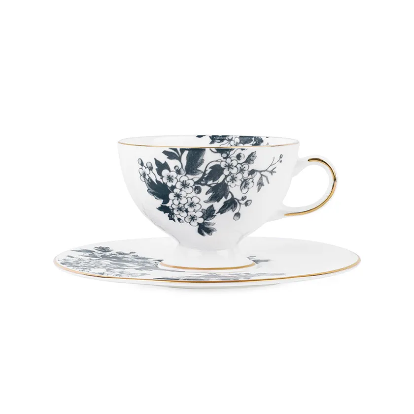 Dette vakre settet med kopp- og skål på 20 cl i antrasitt gir et moderne og stilrent preg. Gullkanten tilfører luksus og gjør settet til et vakkert innslag på bordet.