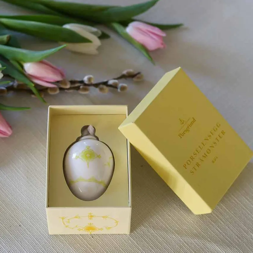 Skap en varm og innbydende påskestemning med dette elegante porselensegget fra Porsgrunds Porselænsfabrik. Med det klassiske Stråmønsteret i en nydelig gulfarge, kombinerer dette egget tradisjon og håndverk i en tidløs dekorasjon. Perfekt for å gi hjemmet et eksklusivt preg til påsken! Dette 4,5 cm høye porselensegget passer perfekt på påskebordet, i en dekorativ skål eller som del av en større samling. Kombiner med andre farger for en stilfull helhet!