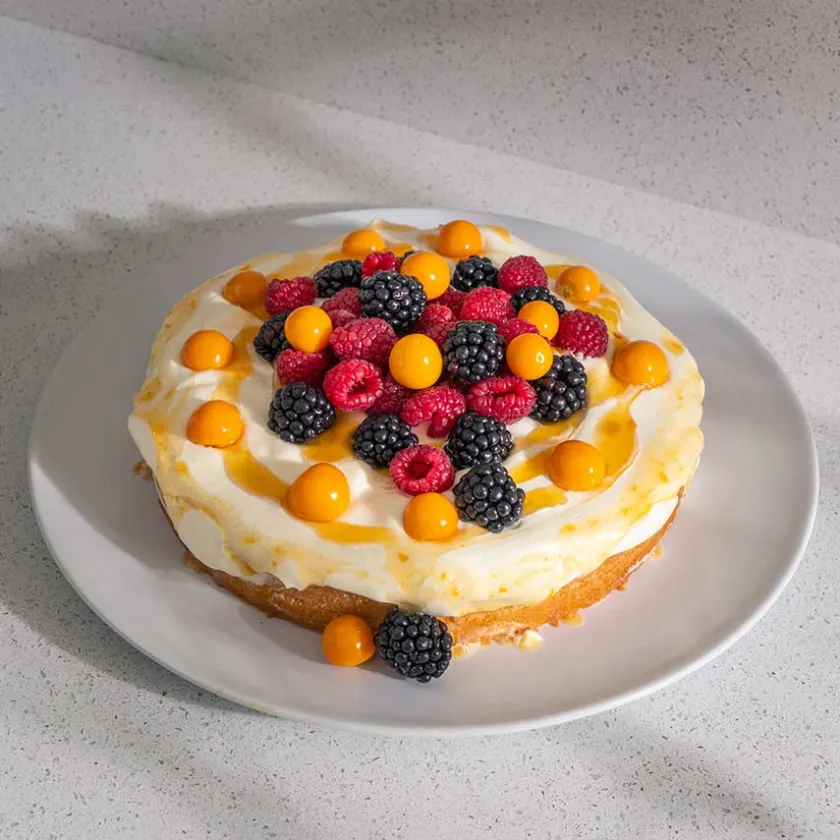 Rundt kakefat på 34 cm fra serien Bake It Easy. Bake It Easy fra Porsgrunds Porselænsfabrik er en funksjonell og praktisk serie som forenkler bakingen. Det stilrene fatet er fremstilt i feltspatporselen, og kommer i rene former som tar seg godt ut i ethvert hjem. Kan rengjøres i oppvaskmaskin.